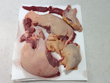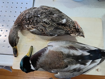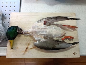 釣行日 11月15日15:00~: | 同行者 ごいちゃんから 釣果 マガモ 2羽 本日の狩猟解禁日にての獲物を頂きました。 早速、食するために下ごしらえを行いました。 ![]() マガモのオスとメスを頂きました ![]() 羽根をむしるのは結構難儀なのですが、今回は比較的容易にむしることができました ![]() 切断後の姿は血が見られるので、きれいな方を撮影しました ![]() 身だけになれば、スーパーで販売されている鶏肉と一緒 明日に鴨南蛮そばで頂く事にしています