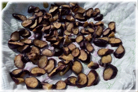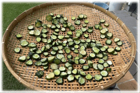 キュウリはいつもキューちゃん漬けにするのですが、今回初めて横山タカ子さんのレシピを参考にして、佃煮にしてみました。キュウリを5mmの暑さに切って、一晩2%の塩で漬けておきます。翌日ぎゅっと絞ってざるに並べて、半日夏の強い日差しに当てます。カリカリに縮んだきゅうりに、酢、醤油、砂糖、生姜、赤トウガラシを煮立てて15分煮詰めます。お日様の力でカリカリとポリポリの食感がご飯にとても合うのです。これも2回作りました。ご飯がすすむ佃煮です。 |