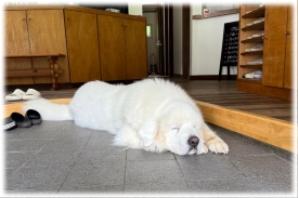 両手に荷物を抱えて買い物から帰ってくると、玄関のたたきでぐっすり眠っているゾーイ。「ゾーイ、ただいま〜」って声を掛けても、ビクともしません。たたきのタイルが冷たくて気持ちがいいのでしょうね。連日の暑さですっかりクーラーで涼むゾーイですが、時には自然の冷たさにぐっすりするのもいいのかな?もうすぐ9月。朝夕は肌寒く感じる高原です。あと少しの辛抱かな?何とか暑い夏を乗り切って、あと3ヶ月で11歳のゾーイです! |