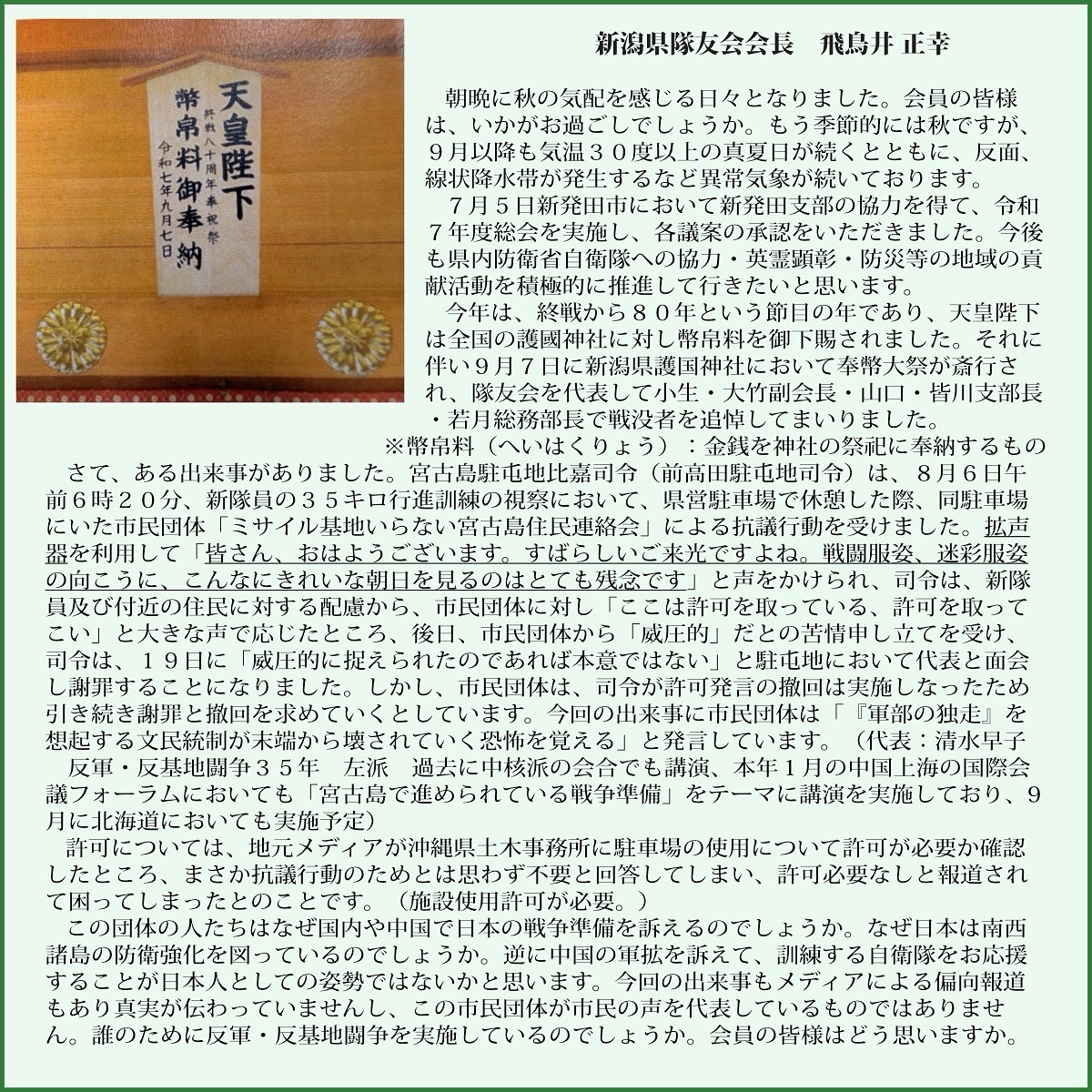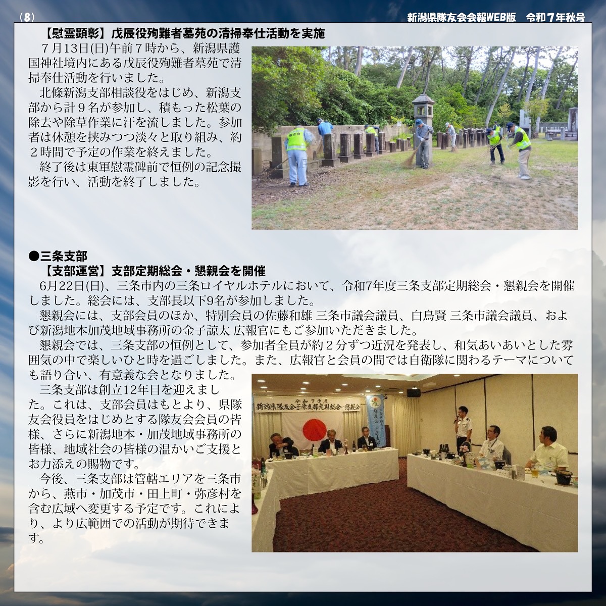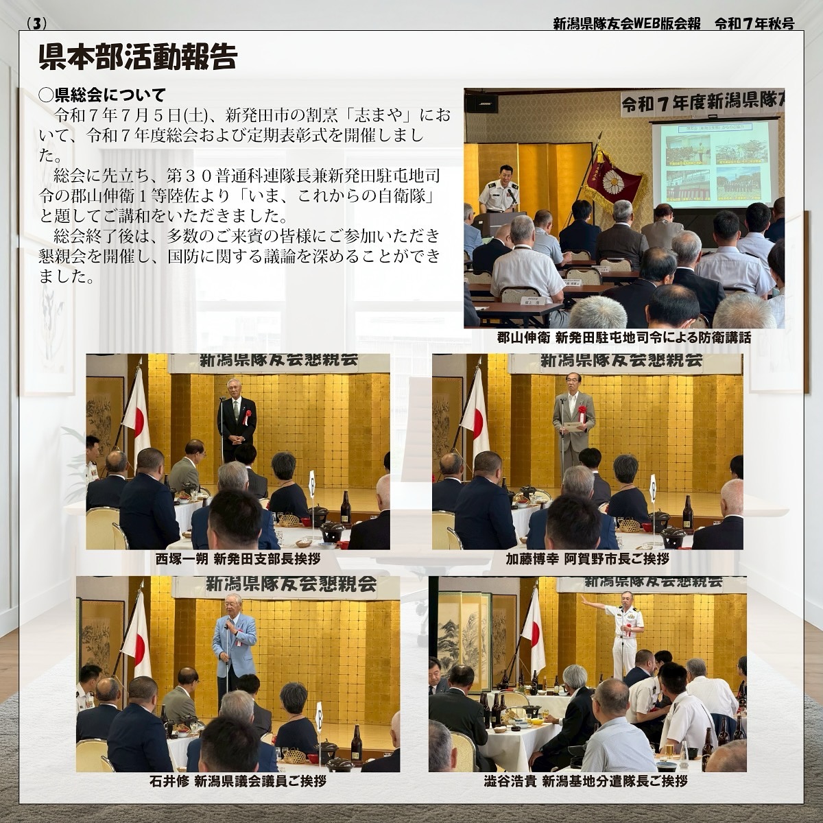 令和7年7月5日、令和7年度総会及び懇親会を、新発田支部担当で新発田市内の割烹「志まや」において、会長他本部役員及び各支部長出席のもと、令和6年度事業計画・収支決算報告、令和7年度事業・予算計画、規約改正及び役員改選についてそれぞれ可決された. また、総会に連携して、第30普通科連隊長兼ねて新発田駐屯地司令の郡山伸衛1等陸佐から演題「いま、これからの自衛隊」について防衛講和をしていただき、参加者一同、防衛に関する知識を深化することができました。
