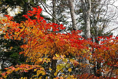 | 28.燧ヶ岳(2)からの続き 10月12日(日) 昨日は、職場の仲間8人で燧ヶ岳に登ってきた。女性一人が足を痛めて今日の登山はできなくなり、7人で会津駒ヶ岳に登る。泊まった民宿「すぎのや」は登山口への入り口のすぐ近くにある。6時少し前に朝食。 民宿の前に出てみると、車が続々と登山口の方に入っていく。民宿の人の話では上の駐車場が一杯になると、役場の人が分岐に立って車を入れないようにするという。急いで出発する。それでも登山口まで行けなかった。駐車地点から12〜13分歩いて登山口に着いた。 7:00. 滝沢登山口発。 登山は木の階段から始まる。日が差してきている。ブナなどの落葉樹林の中を登る。最初は木々の葉は緑色で紅葉していないが、登るに従って次第に紅葉が深くなる。 7:40. ヘリポート跡から少し上の標柱で5分休憩。 鮮やかな紅葉の中を登る。 8:25. 水場、「山頂まで2.9km」。 5分休憩。シラビソが多くなる。 9:15. 「山頂まで1.7km」 9:20. 発。 このすぐ上で北側の視界が開けてなだらかな大戸沢岳の山頂が見え、さらに駒ヶ岳の山頂も見えてくる。山腹のシラビソには霧氷が着いて白く光っていた。木道に出てしばらくすると湿原状のところに出て、ベンチがあり、駒ヶ岳の山頂が大きく見える。湿原の草紅葉、緑色のササ原、周囲のシラビソの濃い緑のコントラストが素晴らしい。しばらく登ると左手(南西)に燧ヶ岳が見えてくる。木道は結構急なところもあり、急ぐと息が切れる。 9:55. 駒ノ小屋の分岐に着く。 すでに大勢の人が来て休んでいた。軽食を摂る。 |