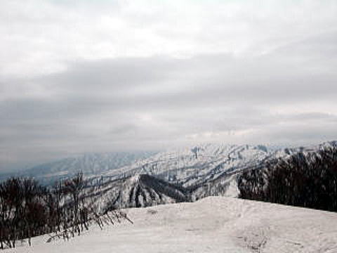 8:35. 見晴らし台着、7合目。 8:40. 発。 ここからは傾斜は緩くなり、のんびりと歩ける。陽は射してはいないが、視界がよいので、とにかく高い方を目指して進んでゆく。緩やかな2つ目のピークにくるとやっと青田南葉山の山頂が見える。 9:15.青田南葉山山頂着。 標識などは雪の下になっている。北に高田市街から日本海が見渡せる。南に籠町南葉山、その右に重倉山、その先に大毛無山が見えるが、その奥に見えるはずの妙高山は雲の中だ。風が少し冷たいので、少し下ったところでおにぎりを食べて休憩する。 |