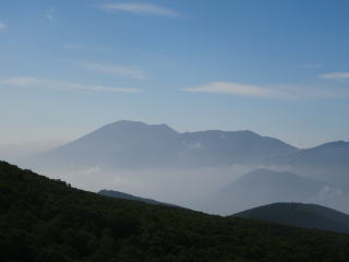 | 8月8日(土) 5:30. 上越高田IC発(車)。 6:10. 須坂長野東IC。 6:40. 菅平牧場駐車場着(菅平で少し迷う)。 一番上の駐車場がほぼ満車の状態だった。朝食を摂る。 7:00. 登山口発。 前回(平成7年)は根子岳から四阿山へ行ったので、今回は反対廻りにまず四阿山を目指す。牧場内の広い道を5分ほど進んで、四阿山への登山道に入る。シラカバ林の中を牧場柵に沿って進んでから右の谷に沿って進む。 7:20. 沢を渡る。 7:50. 5分休憩。その後もシラカバ林が続く。 8:20. 1917mピーク。5分休憩。 南方の視界の左端に浅間山、その右に、高峰高原、篭ノ登山、湯ノ丸山が連なって見える。その右奥に、後立山連峰が見えた。 |