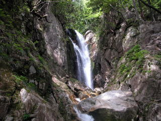 9:10. 貴船滝。 滝の写真を撮りに来ている人が2人いた。右岸から沢に下って、左岸を高巻きして貴船滝の上に出る。ロープやハシゴが設置されている。 |