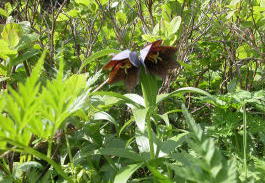 | 7:50. 馬の立髪。 8:15. 殿ヶ池避難小屋着。 8:35. 発。ここから下は低木帯に入り、お花畑はなくなる。緩やかなところも少しあるが、ほとんどは尾根の急坂が続く。ササユリが2株咲いていた。キヌガサソウ、シモツケ、ハクサンオミナエシ(コキンレイカ)、ハクサンシャクナゲなどが少し咲いていた。 |