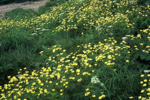 | 12:30.大石山発。 霧で視界は悪く、風も少し強く吹いている。すぐに、丈の低い笹の中に黄色いニッコウキスゲが見え始め、道の端にはヒメサユリがピンクの花を咲かせていた。低草地には、シラネニンジンやイブキトラノオの白い花が風に揺れ、その中にオレンジ色のクルマユリやヤマスカシユリ、あるいは、ハクサンフウロ、ヨツバシオガマ、タカネマツムシソウ、タカネナデシコなどのそれぞれ微妙に異なった紫色の花が咲いていた。 |