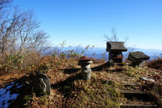 | 13:00. 山頂発。 電波塔の脇を通って下る。急斜面を下ると鵜川神社の広場に出る。 13:05. 鵜川神社。 右に磯之辺への道が分岐している。清水谷・白倉への道は神社の裏から出ている。広い歩き易い道が続く。 |