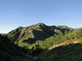 今朝は晴れ上がって、赤牛岳が朝日に照らされた姿を見せている。 |