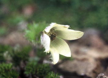 9:00.硫黄岳山荘着。 軽食を摂る。 9:15.山荘発。 山荘附近から横岳への稜線にはいろいろな花が咲いていた。ツクモグサ(初めて見た)、オヤマノエンドウ、シロバナオヤマノエンドウ、コイワカガミ、ミヤマシオガマ、ウルップソウ、ハクサンイチゲ、チシマアマナ、キバナシャクナゲなど。 10:20.横岳山頂(大権現)着。 小雨、濃霧で周囲は何も見えない。 10:30.横岳山頂発。 険しい岩場もあったようだが、霧の中を足元だけを見ていたので、危険を感じることはなかった。 |